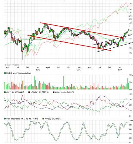 Der Chart enthält wenig Geheimnisse. Man sieht oben einen stabilen Aufwärtstrend, der unter hohem Volumen vor 2 Tagen nochmals nach oben verlassen wurde. Ich hab kein Charttool für die Heimatbörse, aber das Volumen in Deutschland ist groß genug um aussagekräftig zu sein denk ich. Von der bisherigen Trendstärke her (ADX bei 40) ist Luft nach oben.