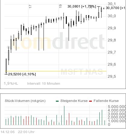 Microsoft stieg bereits gestern auf den höchsten Kurs seit März 2002 und war damit der größte Gewinner im Dow Jones. Der Software-Titel profitierte in einem sehr festen Marktumfeld auch noch von einem optimistischen Analystenkommentar. Analyst Adam Holt von J.P. Morgan rechnet mit starken Verkaufszahlen bei der Software und den Unterhaltungsgeräten des Technologiekonzerns. Holt bezieht sich dabei auf ein Gespräch mit zahlreichen Führungskräften des Softwarekonzerns, das er auf der Consumer Electronics Show in Las Vegas geführt hatte. Danach entwickelt sich der Konzernbereich Unterhaltungssoftware und -Geräte in der 2. Hälfte des Jahres profitabler als der Markt bislang erwartet hatte. Der Blue Chip gewinnt derzeit 47 Cent auf 31,17 Dollar, also 1,53%.