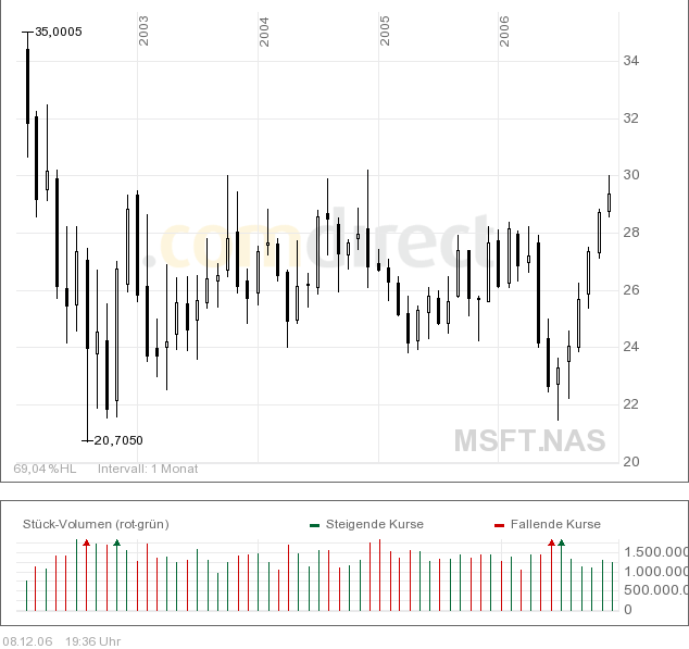 Grund: Vista wird einen neuen Hardware-Software-Zyklus anstoßen. Windows XP ist ja nun schon 5 Jahre alt. Wenn die Firmen diese "Runderneuerung" durchziehen - 64 bit bietet ja auch einen technologischen Anreiz - könnte MSFT in 2007 weiter boomen. Wenn es Mr. Softie gelingt, Apple (iPod) mit "Zune" Marktanteile abzunehmen, wird erst recht Geld verdient.