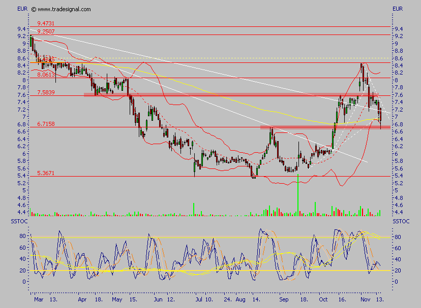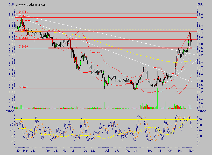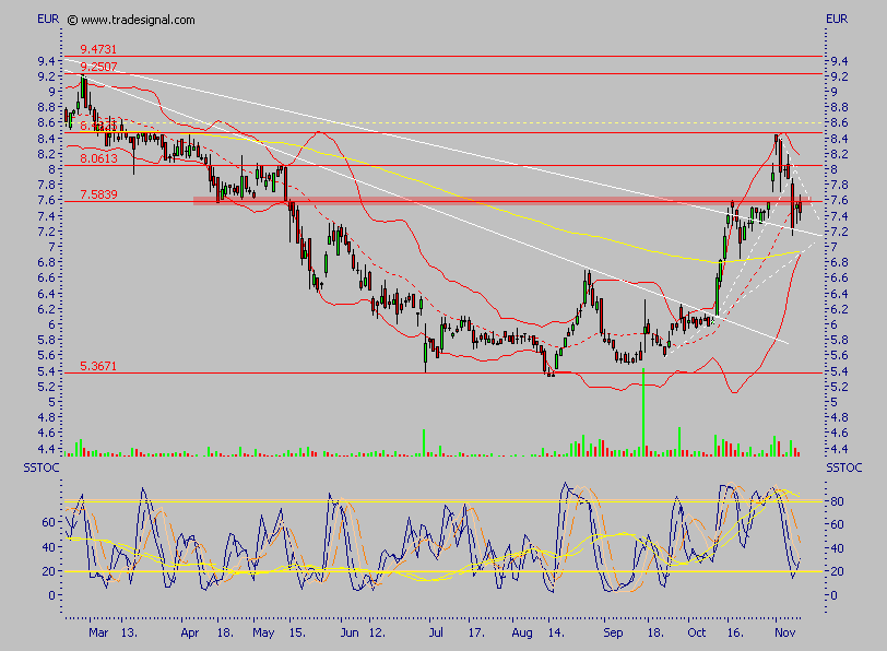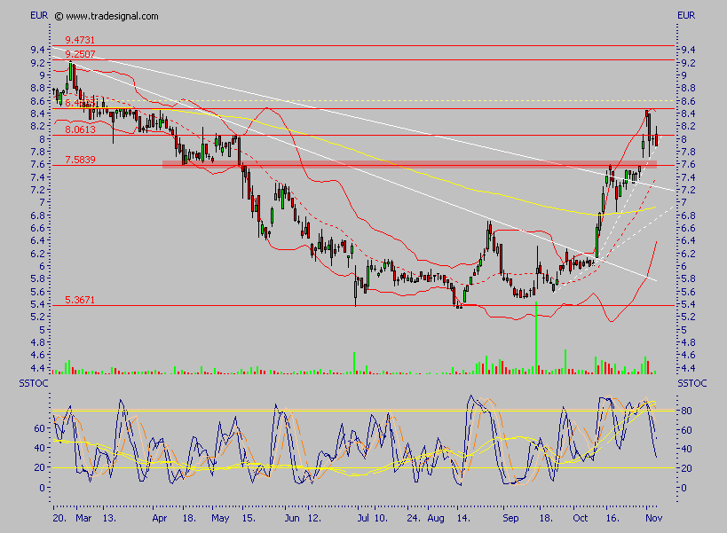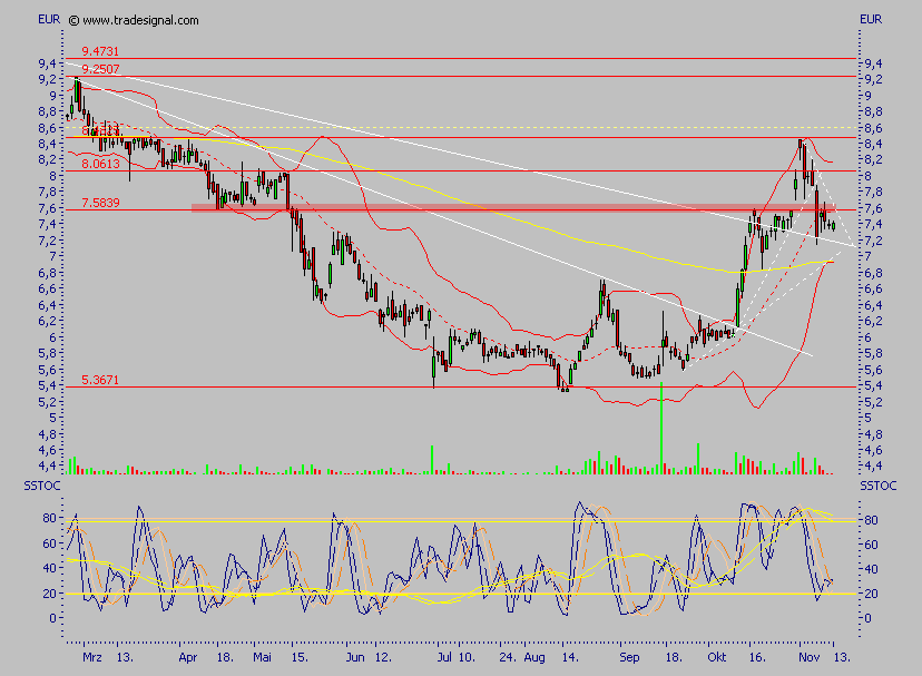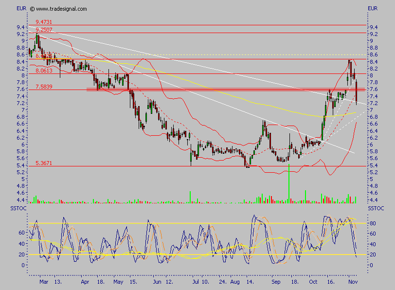 Einstiege genau hier, also bei ca. 7,60 und bei 7,00, platziert, derzeit steht sie direkt auf der Mittellinie der Bollinger Bänder, läuft sie per Schlußkurs drunter, so sind in der Tat nochmal Kurse um 7,00 möglich, ohne daß der Trend davon im Geringsten betroffen wäre, erst unter 7,00 wird es schwierig, davon gehe ich aber eher nicht aus, ich denke sogar, daß die derzeitige Kursschwäche durchaus für Einstiege genutzt werden kann.