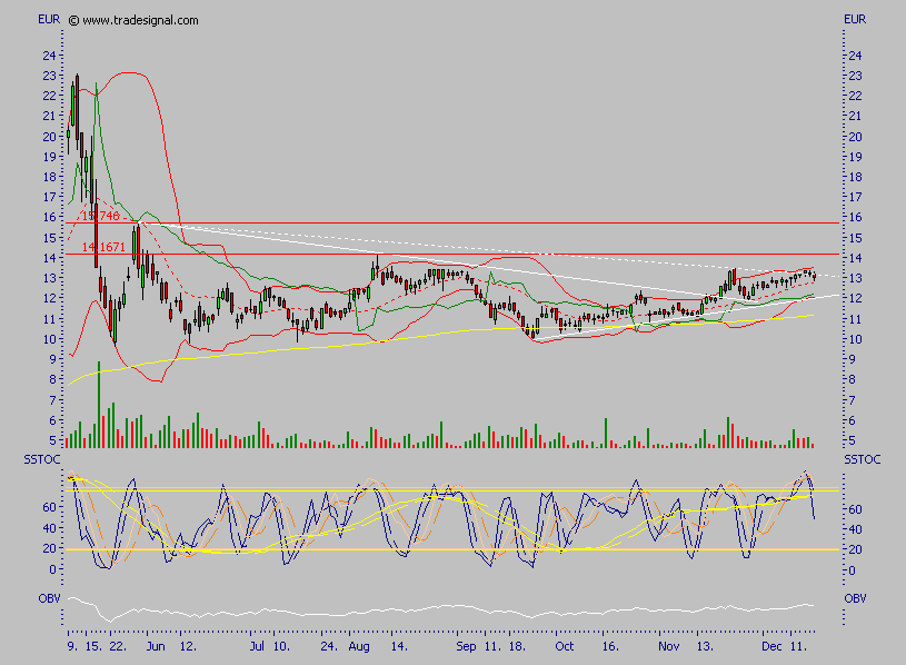 Nordex korrigiert jetzt, derzeit hält die Mittellinie des Bollinger Bandes (rot punktiert), wenn sie den kompletten Move korrigiert, könnte es bis an den Trend bei ca. 12,10 führen, aber derzeit hält sie sich noch gut und die schnelle Stochastik ist bereits reichlich abgekühlt, es darf also nicht verwundern, wenn sie nochmals hochdreht