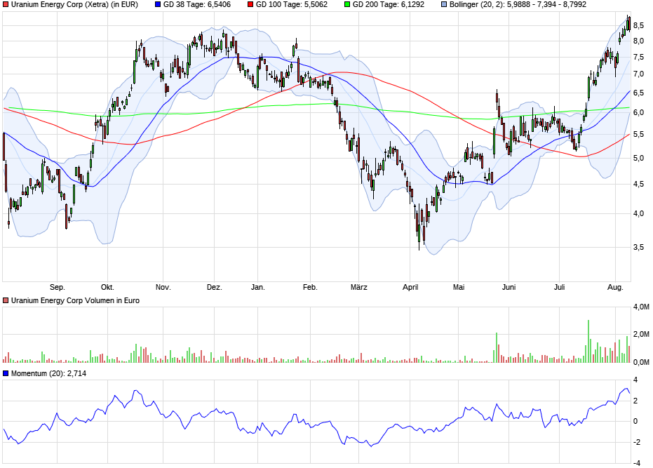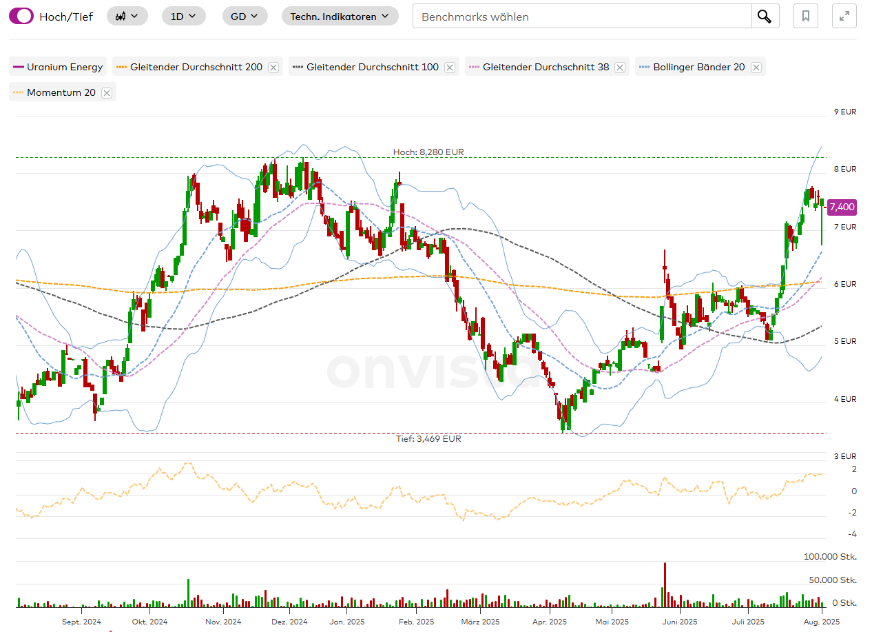 Die Uranium Energy-Aktie war in der Vergangenheit durch eine sehr hohe Schwankungsbreite geprägt. Am Dienstag verliert sie leicht und steht aktuell bei rund 8 €. Damit verdoppelte sie sich gegenüber dem Tief im April bei 3,70 €. Was ist hier jetzt ratsam?