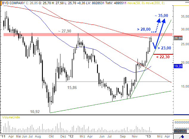 Die Rally des chinesischen Fahrzeughersteller BYD Company Ltd. führte die Aktie bereits beinahe bis zum vorausliegenden Widerstand bei 27,90 $. Ein direkter Ausbruch erscheint nach der bisherigen Performance fast schon übertrieben und aus dieser Betrachtung heraus könnte es nunmehr in Kürze zu einer zwischengeschalteten Konsolidierung bis maximal rund 23,00 $ kommen. Ein Überwinden von 28,00 $ verspricht hingegen unmittelbare Zugewinne bis zunächst rund 35,00 $.