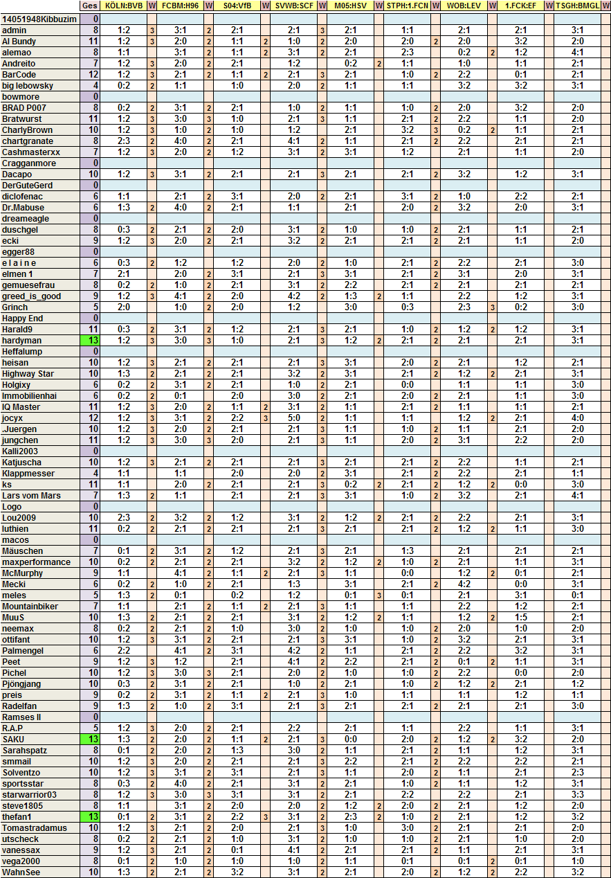 Im hinteren Drittel kommt Bratwurst immer besser in die Gänge, zeigt sein Durchschnitt von 9,00 p. Spieltag, der 6.beste Durchschnitt aller Tipper mittlerweile.. Und Mörf rappelt sich auf und überholt gleich 5 Mann.. Wer kann ihn bremsen?? :o)