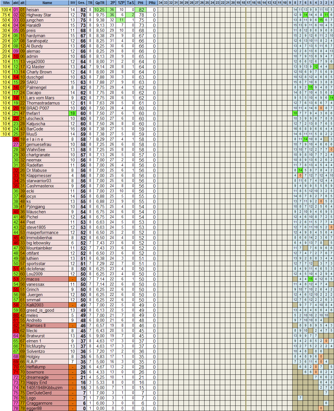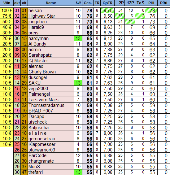 heisan nach wie vor Nummer 1, konnte seinen Vorsprung minimalst ausbauen!! größter Satz nach vorne - thefan1 mit seinem Tagessieg..