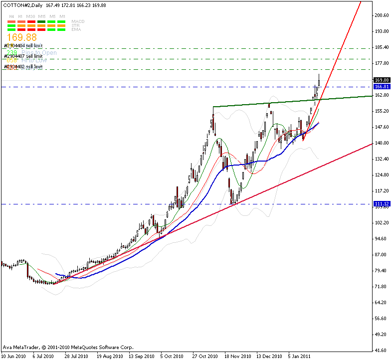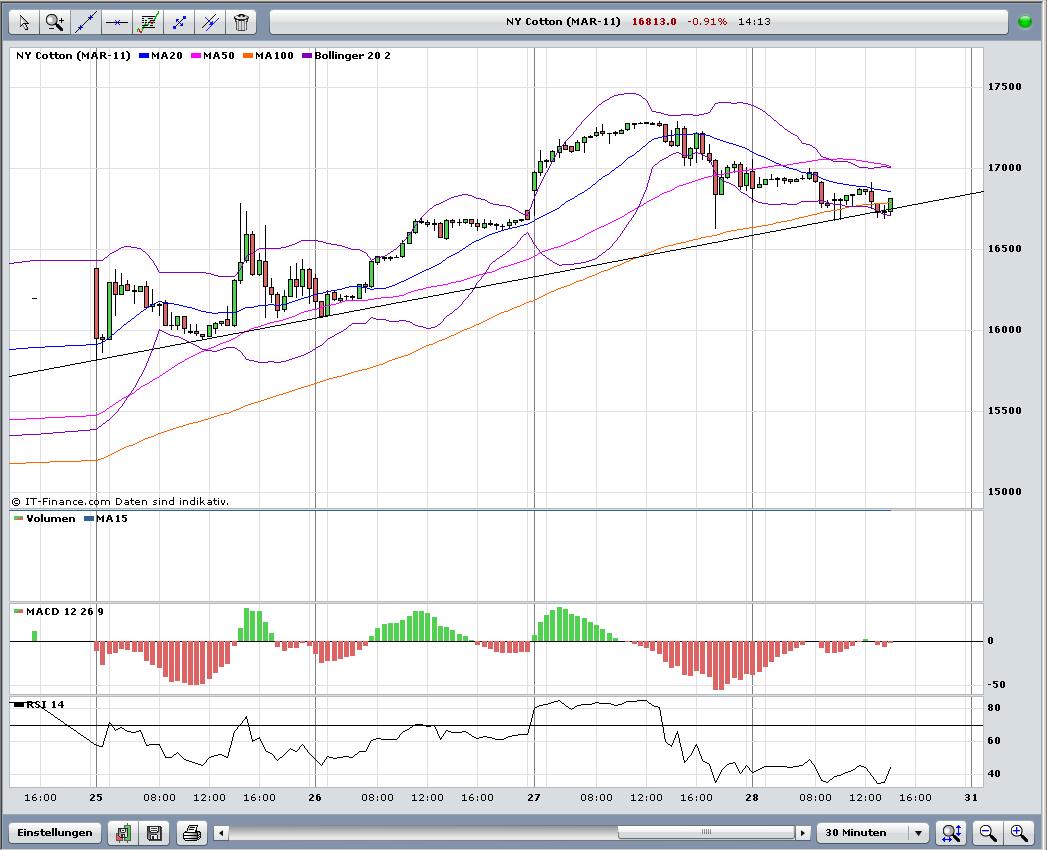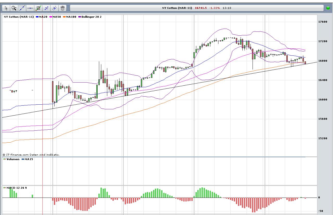 So z.B. jetzt gerade für Mai Kontrakt auf Baumwolle, dieser steht bei 163,5 US cent pro amerikanisches Pfund (Abkürzung: lb) = 453,592 Gramm. Mit einem Kontrakt kauft man 50.000 lb (mit dem Erfüllungsziel: Mai 2011)