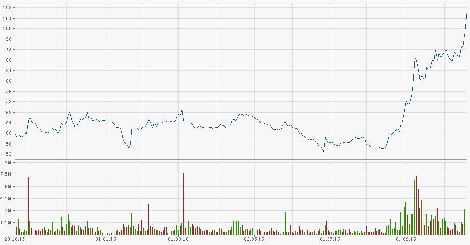 Jahreshoch St. 92,32 Rub (Close 88,68 +12,75%) - Performance auf 1 Monat + 65%