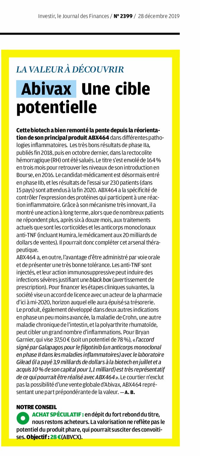 ABX464 hat außerdem den Vorteil, dass es oral verabreicht wird und sehr gut verträglich ist. Die Anti-NVTs werden gespritzt, und ihre immunsuppressive Wirkung kann schwere Infektionen auslösen, die eine Black Box rechtfertigen (Verschreibungswarnung). Zur Finanzierung der nächsten klinischen Schritte strebt das Unternehmen bis Mitte 2020 einen Lizenzvertrag mit einem Pharmaunternehmen an, bis dahin wird der Cashflow erschöpft sein. Das Produkt, das in einem etwas früheren Stadium auch in zwei weiteren Indikationen entwickelt wird, nämlich bei Morbus Crohn, einer weiteren chronischen Darmerkrankung, und bei rheumatoider Arthritis, kann gegen eine Vielzahl von Entzündungen gerichtet sein. Für Bryan Garnier, der 37,50 Euro (ein Potenzial von 78%) anstrebt, "ist die Vereinbarung von Galapagos für Filgotinib (ein monoklonaler Antikörper in Phase II bei Entzündungskrankheiten) mit dem Gilead-Labor (es zahlte im Juli 3,9 Milliarden Dollar an die Biotechfirma und erwarb 10% des Kapitals für 1,1 Milliarden Dollar) sehr repräsentativ dafür, was mit abx464 erreicht werden könnte".