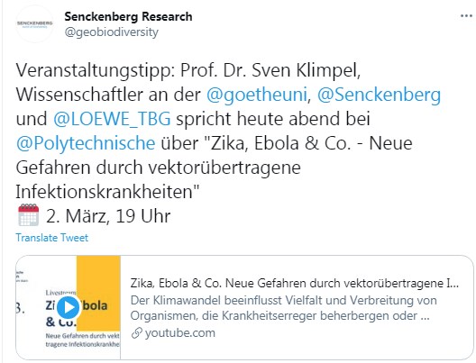 Der Klimawandel beeinflusst Vielfalt und Verbreitung von Organismen, die Krankheitserreger beherbergen oder übertragen. Stechmücken gelten weltweit als die wichtigsten Überträger, dicht gefolgt von Nagern und Fledertieren. Solche Vektoren können die Gesundheit von Menschen sowie Nutz- und Wildtieren bedrohen. Die potenziell dramatischen Folgen führt uns die SARS-CoV-2-Pandemie vor Augen. Sven Klimpel veranschaulicht in seinem Vortrag die Artenvielfalt und die genetische Vielfalt medizinisch relevanter Organismen. Er zeigt Areal- und Populationsdynamik, Ökologie, Lebenszyklen und Übertragungsmechanismen auf und erklärt, inwiefern die durch sie übertragenen Infektionskrankheiten auch in Europa spürbar zunehmen. Sven Klimpel leitet seit 2017 als Dekan den Fachbereich Biowissenschaften an der Goethe-Universität und hat die Professur „Integrative Parasitologie und Tierphysiologie“ inne. Zusätzlich verantwortet er den Forschungsbereich „Medical Biodiversity and Parasitology“ am Senckenberg Biodiversität und Klima Forschungszentrum (SBiK-F Leibniz) und leitet den Projektbereich „Genomisches Biomonitoring“ im LOEWE Centre for Translational Biodiversity Genomics.