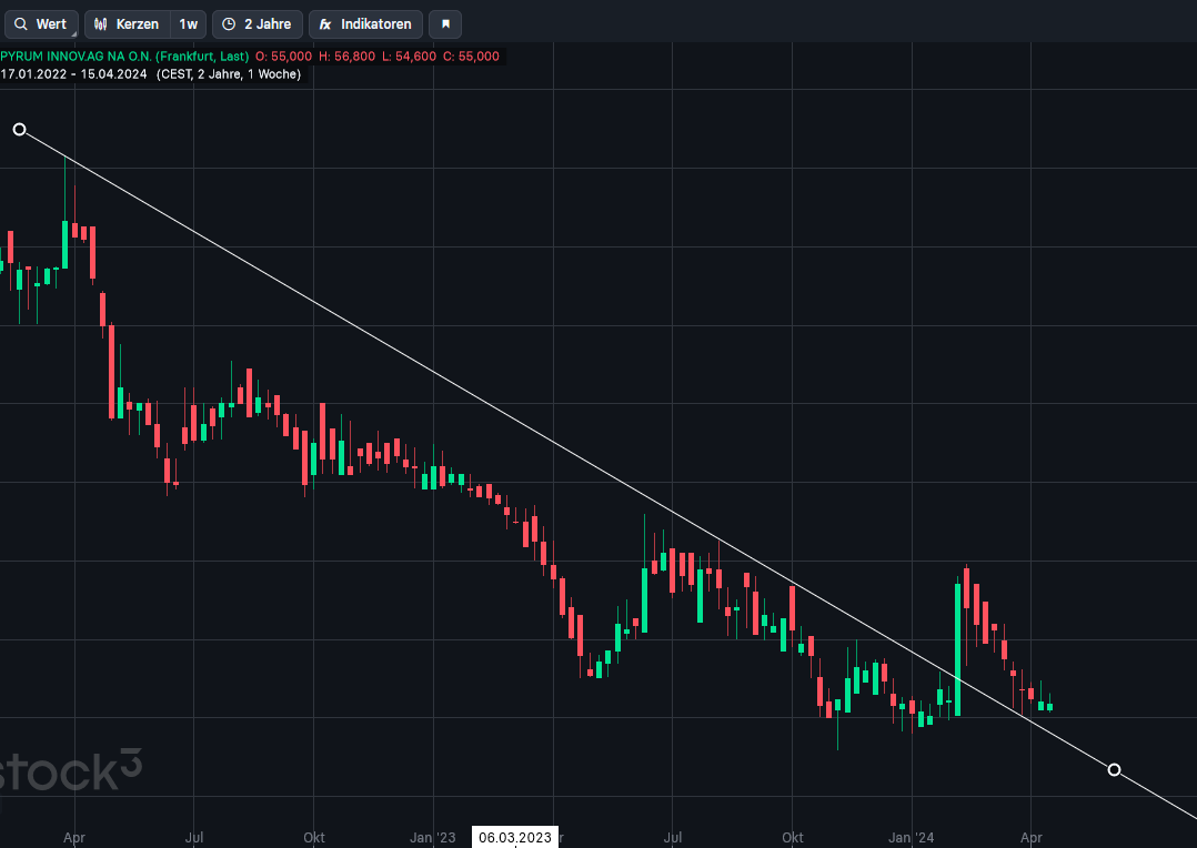 seit meinem letzten Post sind nun ein paar Monate vergangen. Nach dem Trendbruch hat sich nicht viel getan. Die Aktie konnte bisher keinen neuen Aufwärtstrend etablieren und ist vorerst lediglich in einen mehrmonatigen Seitwärtstrend übergegangen. Es bleibt spannend, ob es hier eine nachhaltige Bodenbildung gibt oder es doch zu einer Vorsetzung des Abwärtstrends kommt. An meiner positiven Einschätzung des Unternehmens „Pyrum Innovations AG“ halte ich fest und ich möchte Euch die Gründe erläutern, warum ich diesen Wert so attraktiv finde.