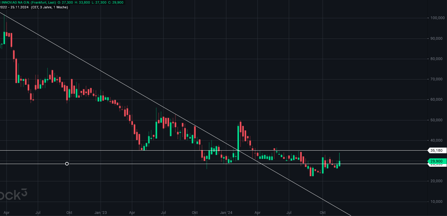 Zum Wochen- und Monatsschluss am 29.11.2024 gelang es der Aktie in den Trend zurückzukehren. Knapp über 30 € ging sie schließlich aus dem Handel. Charttechnisch betrachtet, ist das ein starkes Signal. Die nächsten Hürden auf der Oberseite liegen nun bei etwa 35 €, 50 € und 60 €. Die Nachrichtenlage in Bezug auf das Unternehmen ist weiterhin gut, daher gehe ich von einer weiteren Stabilisierung des Kurses auf diesem Niveau aus. Die Marke von 35 € sollte demnächst fallen und den Weg nach oben frei machen.