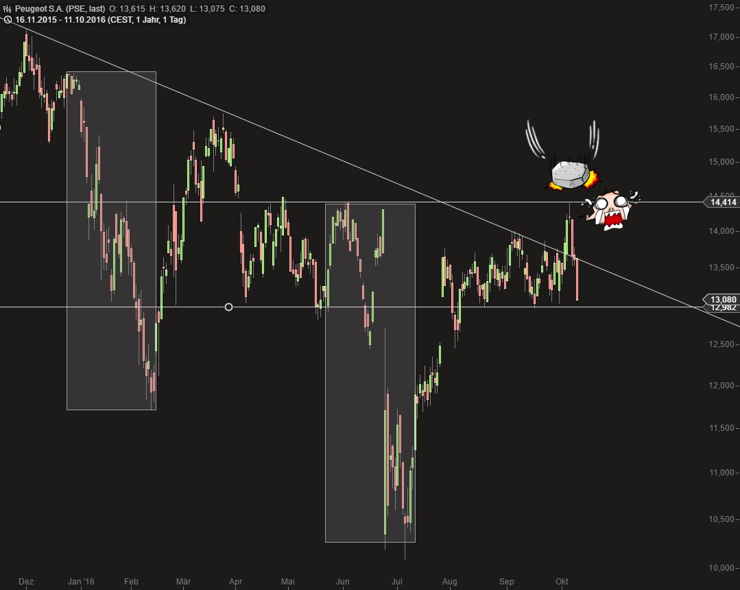 Vorgestern sah es so aus, als gelingt Peugeot der Ausbruch, aber wieder war die Rückkehr an die 13.50 Marke das Ende. Heute werden vielleicht endlich die 13,50 durchbrochen.