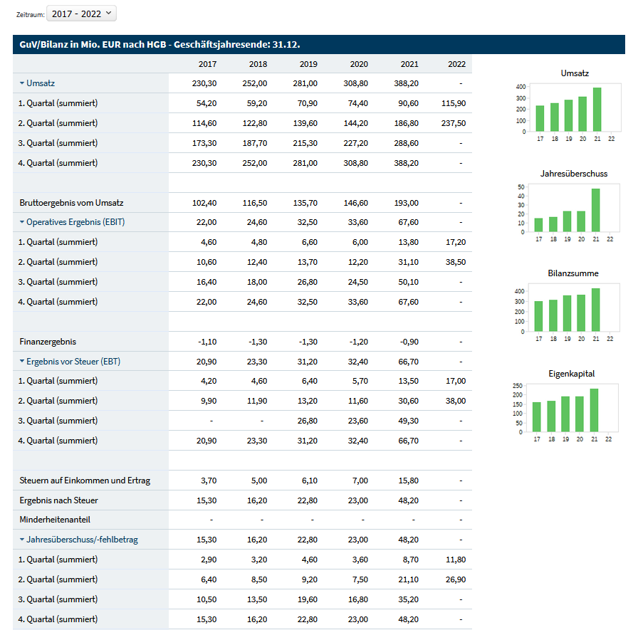 an der man schön sehen kann, welch hohes Niveau die Zahlen aus dem Jahr 2021 hatten,(z.B.Jahresüberschuss 2020 zu 2021 mehr als verdoppelt) und nun als Basis für 2022 dienen.
