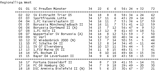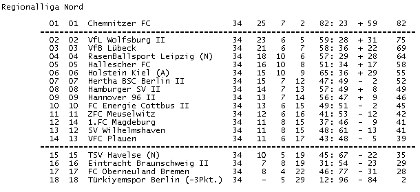 Aufsteiger zur Regio Nord kommen nur aus der Oberliga Hamburg (FC Sankt Pauli Hamburg II), aus der Oberliga NOFV Nord (Torgelower SV Greif oder FC Hansa Rostock II, entscheidet sich morgen ab 14:00), aus der Niedersachsenliga (SV Meppen oder BV Cloppenburg oder gar Kickers Emden, entscheidet sich erst die nä beiden Wochenenden im Juni, bis 11.06., da sind die letzten Begegnungen erst), und aus der Oberliga NOFV Süd (Germania Halberstadt)..