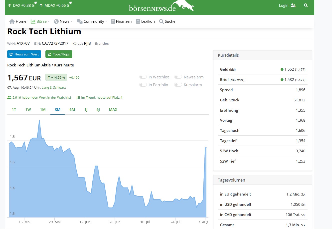 Seit dem Deal mit Mercedes vor 1 Jahr ist bedauerlicherweise nichts mehr mit wirklicher Substanz von Rock Tech gekommen. Kein zweiter Kunde neben Mercedes, obwohl die Interessenten angeblich Schlange stehen, kein Spodumenlieferant, obwohl angeblich seit über 1 Jahr Verhandlungen laufen, keine Finanzierung, obwohl die von Harbecke konservativ geschätzt spätestens seit März abgeschlossen sein sollte und kein Unternehmen dass sich direkt am Konverter oder der Mine beteiligt, obwohl man die Kapitalerhöhung vor 1 Jahr vorzeitig bei ca 30 statt 50 Mio CA$ beendet hat, weil man mit dem Assetverkauf einen Weg der Finanzierung gefunden hat, der eine Aktienverwässerung vermeidet. Stattdessen steht das Projekt wegen Geldmangel seit Monaten still und die vorläufige Baugenehmigung, die man im Januar erhalten hat, stellt sich als vollkommen nutzlos heraus. Man kann die Alarmglocken bei Rock Tech leider gar nicht häufig und laut genug schrillen lassen.