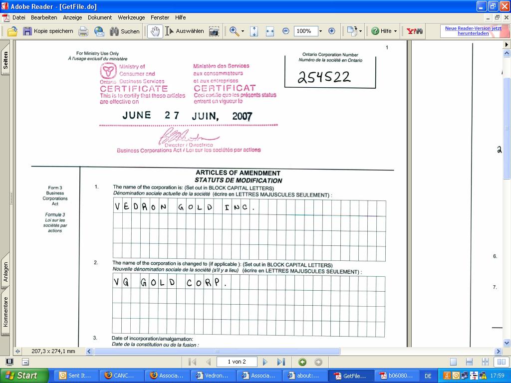 schauen. Heute schon wieder etwas Neues mit Datum von gestern. Ab 7. August wird die Umbennung an der Börse vollzogen. Dann kann man auch endlich mit VG Gold Corp Aktien handeln und nicht mehr mit Vedron Gold.