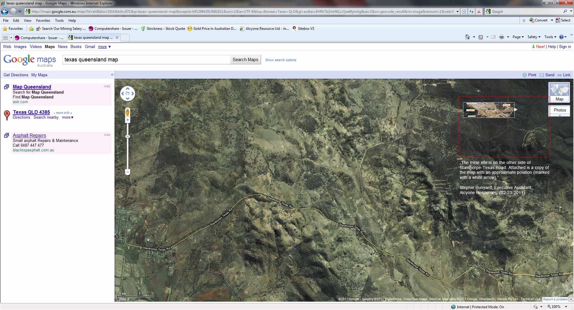 Apologies for the delay but Mr King was interstate and has just returned to the office. The position you used is wrong. The mine site is on the other side of Stanthorpe-Texas Road. Attached is a copy of the map with an approximate position (marked with a white arrow).