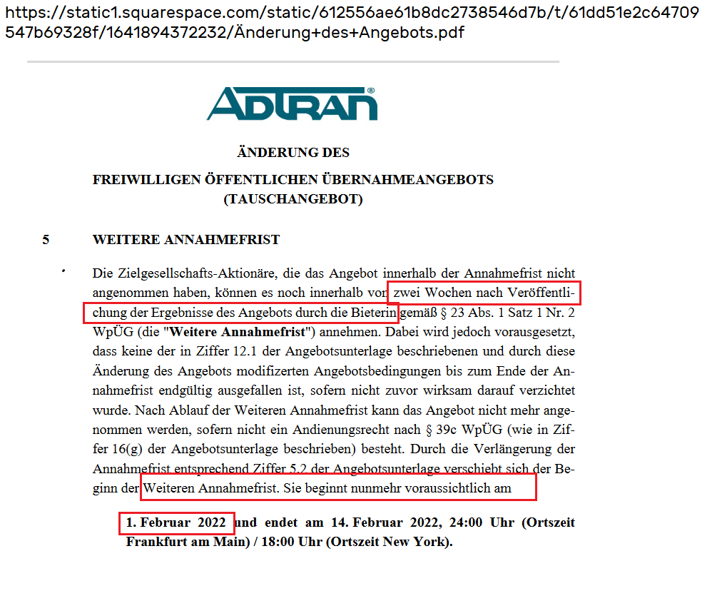 Richtig. Man hat zwei Wochen Zeit nach Veröffentlichung der Ergebnisse, um diese erweiterte Angebotsfrist noch zu nutzen (natürlich nur unter der Voraussetzung die 60% wurden vorher erreicht). Diese Frist beginnt ( laut den Angebotsunterlagen vom 11.1.2022) mit dem 1.2.2022. Von daher würde ich vermuten, es ist geplant die erreichte Prozentzahl Ende Januar bzw. am 31.1.2022 zu veröffentlichen oder sehr früh am 1.2.2022. Von daher eben noch ein paar Tage jetzt warten. Für mich eh nicht mehr relevant, da ich nach der negativen Kurs-Reaktion bei der Adtran-Aktie nach HV-Abstimmung und dem dadurch klar eingetrübten Chartbild bei Adtran raus bin bei ADVA als man noch im mittleren 13er Bereich stand. Relevant ist für mich nur gewesen die Differenz des Adtran-Kurses in Euro multipliziert mit 0,82 ( d.h. dem Umtauschverhältnis). Da war der ADVA Kurs nach abrutschen von der Adtran-Aktie mir dann bereits zu nahe am rechnerischen Umtausch-Kurs, falls die Übernahme klappt. Entsprechend wäre eine Kursreaktion nach oben im Falle von 60% +x nicht mehr so hoch. Und es könnten nochmal weitere Adtran-Aktionäre werfen ( die gegen dieses Übernahme stimmten), die nach der Adtran-HV erstmal noch sehen wollten, ob die Übernahme erreicht wird. Im Gegenzug kann es bei Nichterreichung der 60% Quote eine negative ruckartige erste Reaktion nach unten geben bei ADVA., weil es Käufer der ADVA Aktie gibt, die darauf spekulierten eine Umtauschprämie noch zu bekommen. Da war mir also das CRV zuletzt nicht mehr so reizvoll. Ich warte jetzt mal ab, ob sich nach der Entscheidung vielleicht ein Überreaktion ergibt, um vielleicht wieder zu kaufen. Kommt aber auch darauf an, ob Tech-Werte weiter als Ganzes von der Börse negativ angesehen werden im einem Umfeld steigender Zinsen und ob ADVA es schafft nicht stärker durch die weiter anhaltende Chip-Knappheit/ höheren Einkaufspreise nicht Einbußen bei Marge und Umsatz zu erhalten. ( =>Intel befürchtet Chip-Knappheit bis ins Jahr 2023 - 27.01.2022 https://www.derstandard.de/story/2000132876609/...23-erzielt-trotzdem ".....Die globale Chip-Knappheit wird nach Einschätzung des Branchenriesen Intel noch mindestens ein Jahr andauern...." ). Denn man sollte nicht nur immer schauen, ob der Deal mit Adtran über die Bühne geht, sondern auch darauf achten wie für ADVA selber das Umfeld aussieht