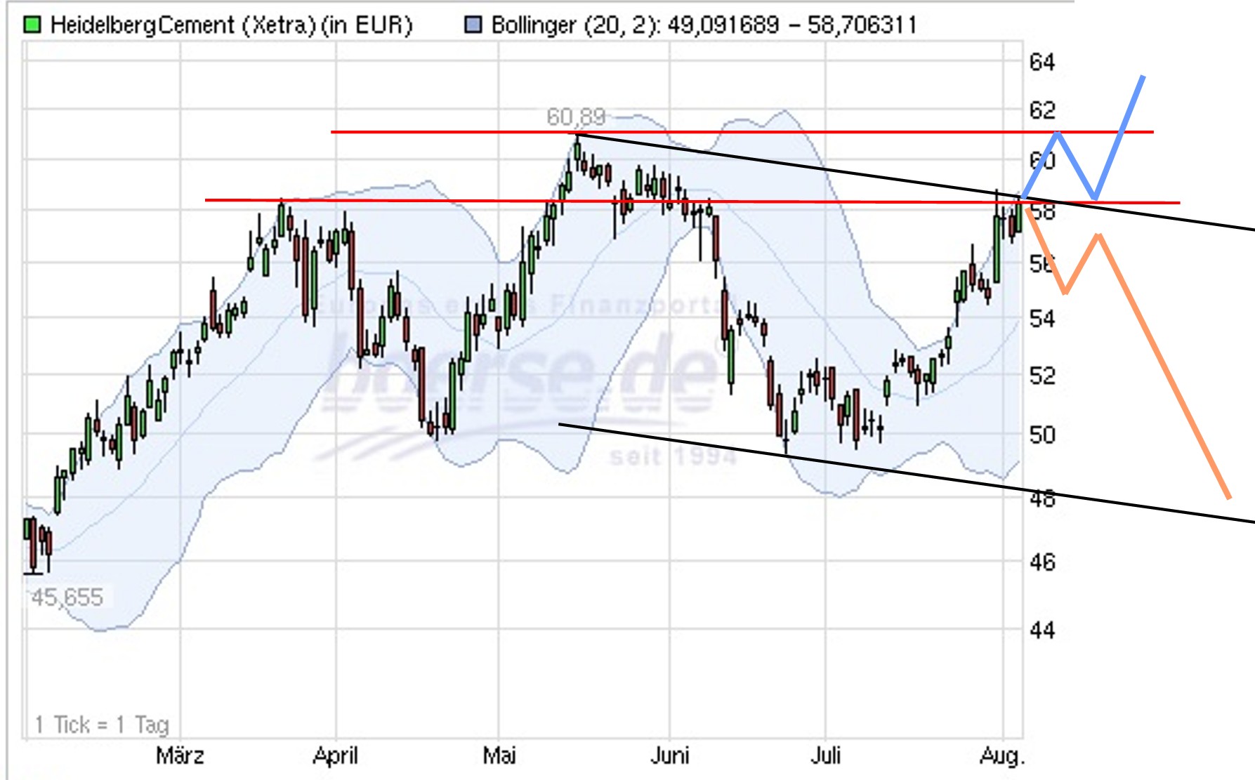 Da man bei HeidelbergZement aber durchaus unterschiedlicher Meinung sein kann (ich finde, man ist bei 58-60 € fair bewertet), ist die Charttechnik durchaus hilfreich, um das Timing zu verbessern.