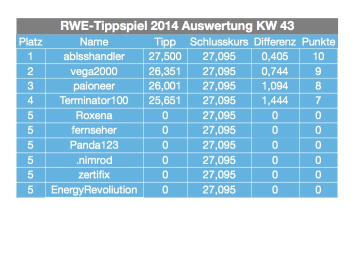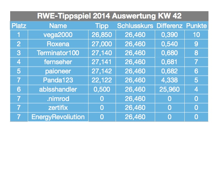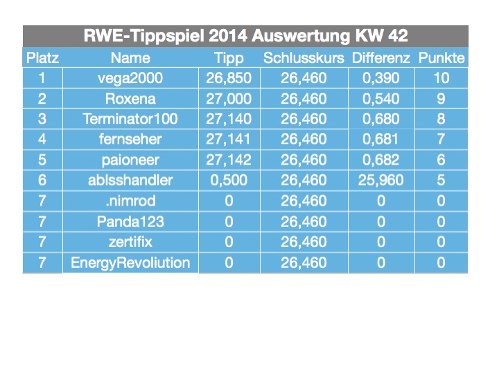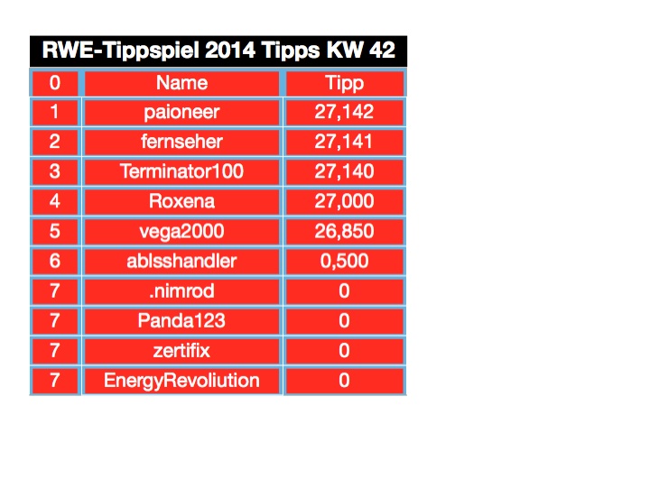 derartige beiträge bitte in die gängigen versorger foren stellen. ist zwar sehr interessant, dieses forum ist jedoch ausschliesslich als tippthread gedacht. bist aber herzlich eingeladen hier mitzumachen. 2014 kannst du dich noch ein wenig warm spielen, um dann 2015 richtig ein/anzugreifen. wir würden uns freuen, denn die anzahl der tippgemeinde ist ja nicht so wirklich prall... ;=))