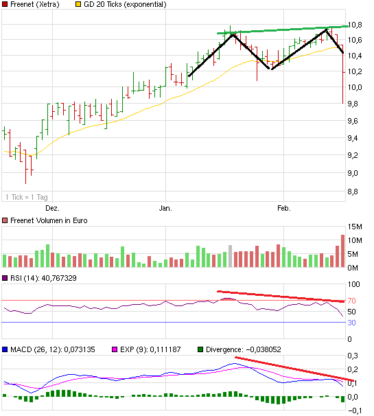 Evtl. übt sich auch der ein oder andere erstmal in Zurückhaltung, bis etwaige Modalitäten des weiteren Verhältnisses zum Großaktionär Drillisch geklärt sind. Indizien sind vor allem einige unklare Termine (die Hauptversammlungen beider Unternehmen, der Termin für die Q1-Zahlen bei Drillisch). Es gibt sicher nicht wenige, die befürchten, daß sanfter Zwang auf Freenet zu einer Fusion/Übernahme ausgeübt werden und daß Freenet dabei etwas zu kurz kommen könnte. Solche Befürchtungen teile ich jedoch nicht, zumindest dann nicht, wenn ein Zusammenschluß auch eine Aktienkomponente beinhaltet, denn dann hätte Drillisch wenig davon, wenn Freenet zu sehr bluten müßte.