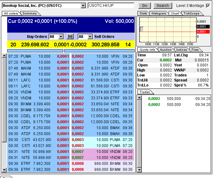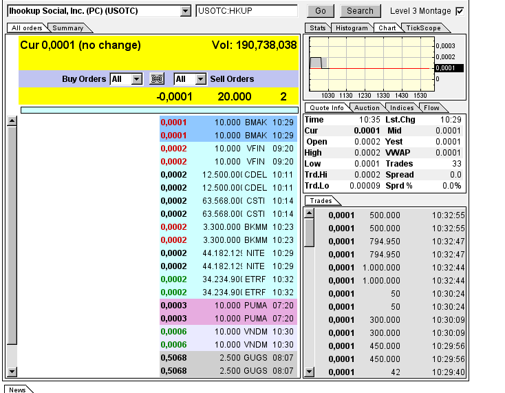 iHookup Social Inc(OTCMKTS:HKUP) stock showed no change to close at $0.00010 in the last trading session and its total traded volume was 84.00 million shares versus average volume of 92.37 million. The company has market cap of $38,970.00.