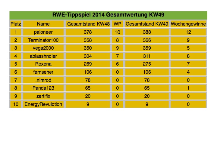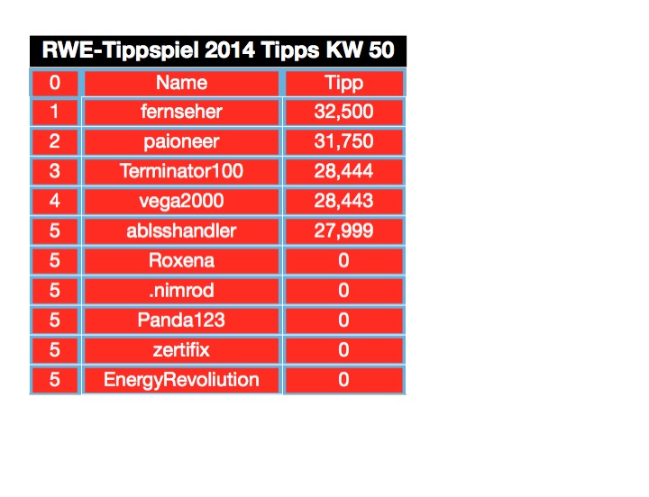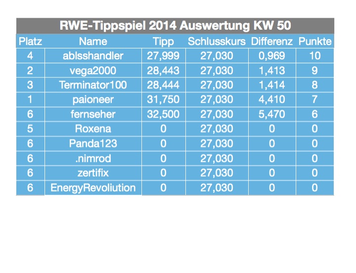 Das Tippen hat Spaß gemacht, die Kursentwicklung von RWE weniger. Da meine Optionen nächste Woche wertlos verfallen und ich auch mich nicht mehr mit den Versorgern befassen möchte ist für mich ein Tippspiel auch in 2015 nicht interessant.
