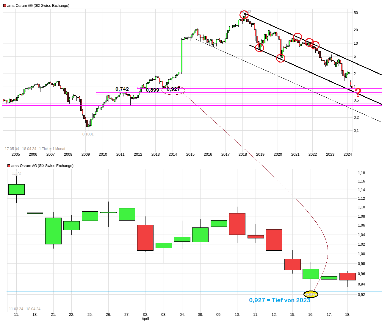Der Kurs kam jüngst exakt an der Unterseite des seit ca. 7 Jahren fallenden Abw.trendkanals zum stehen und vor den übermorgen morgen kommenden Q.1 Zahlen (Freitag, 26.4.) entfernt man sich nun wieder etwas von dieser Linie. Ich habe daher aus spekulativen und charttechnischen Gründen eine nicht zu große Position gekauft und warte jetzt mal ab, ob vielleicht die negative Erwartungshaltung bereits durch die deutlichen Rücksetzer der jüngsten Zeit mehr als hinreichend eingepreist wurden. Sollte es keine neuen Hiobsbotschaften geben, dann wäre vielleicht etwas weitere technische Erholung möglich. Umgekehrt würde ich bei unterschreiten dieser unteren Trendkanallinie die Position erstmal wieder schließen.