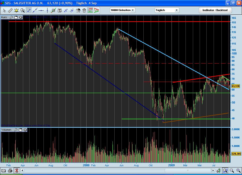 Aus charttechnischer Sicht betrachtet ist die Aktie des 2. größten deutschen Herstellers von Stahlerzeugnissen am oberen Abwärtstrend im Bereich um 73 -74 Euro abgeprallt.
