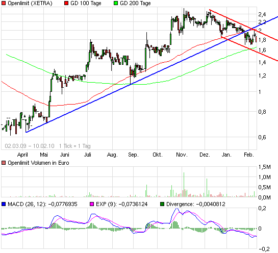 Man sieht, dass der Kurs gerade am unteren Trendrand anklopft. Fällt die 1,72 Euro ist der nächste Widerstand bei 1,67.