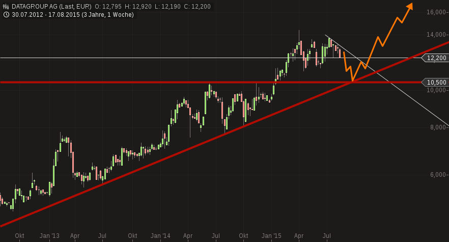 ist im Moment mit Datagroup nicht so viel zu holen. Kurzfristig ist hier ein fallendes Dreieck mit Unterseite 12,20€ entscheidend. Sollte das Dreieck nach unter verlassen werden, kann ich mir durchaus 10,50€ bis Ende September vorstellen. Dort verläuft der seit 2009 gültige langfristige Aufwärtstrend und eine markante horizontale Unterstützungslinie (alte Hochs aus 2014).