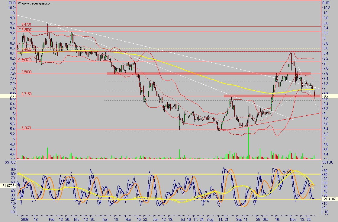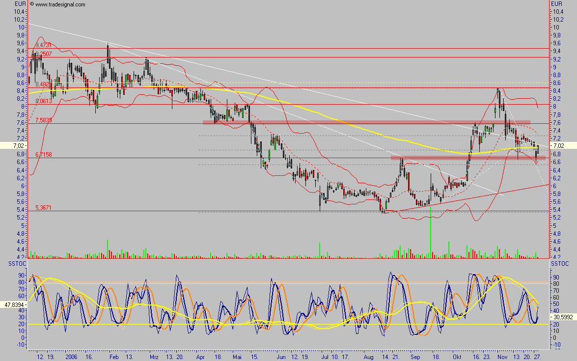 scheint sich bei 7 Euro auszubilden....hält ja momentan sehr gut, wenn man das negative Marktumfeld heute berücksichtigt.Denke die 7 werden die neue Basis von der aus höhere Bereiche angegriffen werden....sollen ja noch Meldungen zwecks Meilensteinzahlungen unsw. kommen.....hab ich zunindest so gelesen....und wer weiss....ein funke könnte reichen um uns nschhaltig über die 8 in richtung 9 zu schiessen. Mein EK ist bei 6,90...lehne mich daher zurück und warte das ich Stück für Stück in die Gewinnzone rutsche....und das werden wir...Medigene wird 2007 sicher Freude machen...