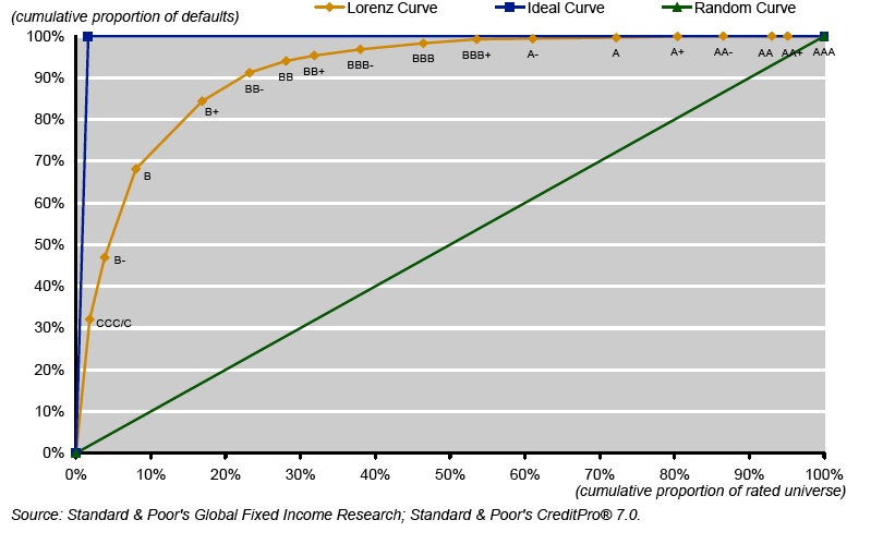 Hier ein Powerdiagramm, das aufgrund des Backtestings eines Rating-Systems geschrieben wurde. Die Daten basieren auf einer S&P-Migrationsmatrix, die besagt, mit welcher Wahrscheinlichkeit ein Kredit binnen eines Jahres in seiner Rating-Klasse verbleibt (verharrt) oder in eine andere wandert (migriert).