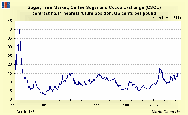 möglich, auch 45-50 Cents. Aber in den letzten 40 Jahren hat sich der Zuckermarkt komplett verwandelt: Damals waren Europa und die USA die größten Zuckerproduzenten, heute sind es Brasilien und Indien. Gerade Brasilien gilt als Zuckerpreis-killer: 2005/2006 ist der Zuckerpreis deutlich gestiegen, aber nach einer Rekordernte in Brasilien wieder um knapp 50% gefallen. Wohin der Zuckerpreis tendiert, ist Spekulation, aber wegen des schwachen Angebots geht es in den nächsten Wochen vermutlich noch ein gutes Stück nach oben, bevor Brasilien den Zuckerpreis tötet.