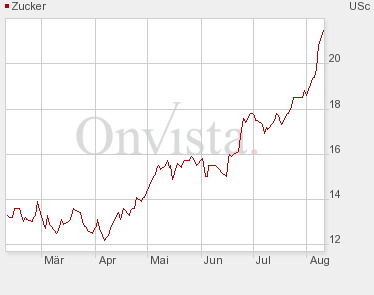 Bei knapp 20 Cent je Pfund kostete Zucker am Donnerstag New York so viel wie seit 28 Jahren nicht mehr, allein seit Mitte Juni hat sich der Rohstoff um mehr als 20 Prozent verteuert. Und es sieht nicht so aus, als ginge der Zucker-Rally schon bald die Luft aus. Die kurzfristigen Marktteilnehmer setzen weiter auf steigende Preise, die Netto-Long-Positionen sind auf das höchste Niveau seit anderthalb Jahren gestiegen.
