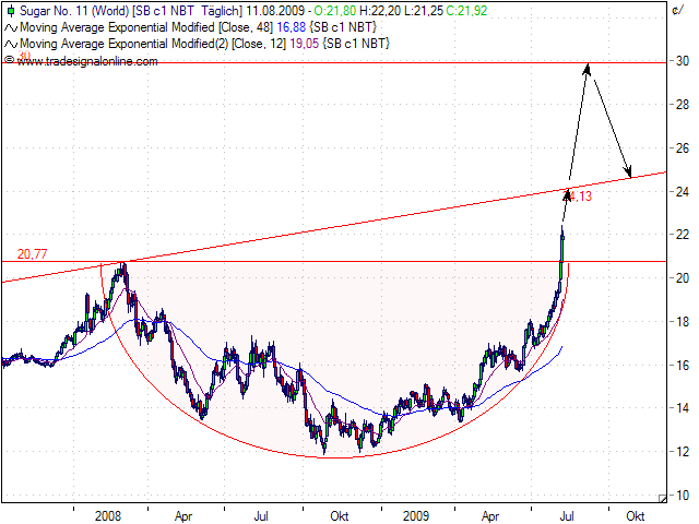 immer steiler, die Konsolidierungen immer kürzer, das Momentum ist extrem hoch. Wagemutige gehen jetzt noch long (getreu dem Motto: "Die Wahrscheinlichkeit eines Trendbruchs ist geringer als die einer Trendfortsetzung"). Ansonsten sollte man warten bis sich ein prozyklisches short-Signal ergibt. short-Antizyklik verbietet sich auch deshalb, weil es keine Preisobergrenzen gibt: Wenn die Zuckerimporteure bereit sind, 100 Cents für 1 Pfund Zucker auszugeben, dann steigt der Preis halt von 20 Cents auf 100 Cents. Aber wehe die darauffolgende Ernte fällt gut aus, dann knallts in den Keller.
