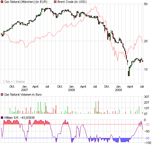 der erdgaspreis in amerika ist nicht an den ölpreis gekoppelt. allerdings gab es in den letzten 2 wochen eine starke korrelation zwischen den beiden, als der brent so stark korrigiert hattte. die woche kann sich der brent wieder bullisch den 63-65$ nähern; gerade heute hat der brent seine 60,50$ unterstützung wieder nicht durchbrochen und sich wieder etwas von ihr nach oben entfernt. trotzdem fällt der erdgas nymex weiter; 3,26$ als heutiges bisheriges tief ist fatal, der war selbst beim absoluten krisentief im april/mai fast nicht so weit unten. gründe scheinen das schlechte wetter auch in den südstaaten von amerika zu sein-wodurch die ganzen stromfressenden klimaanlagen nicht gebraucht werden. und für diese woche bleibt das wetter schlecht-bzw es wird aufs wochenende hin noch milder als heute!!also obacht; evt lässt sich das erdgas nochmal ne woche zeit bis zum aufwärtstrend- außer es lässt sich durch einen steigenden ölpreis mitziehen!