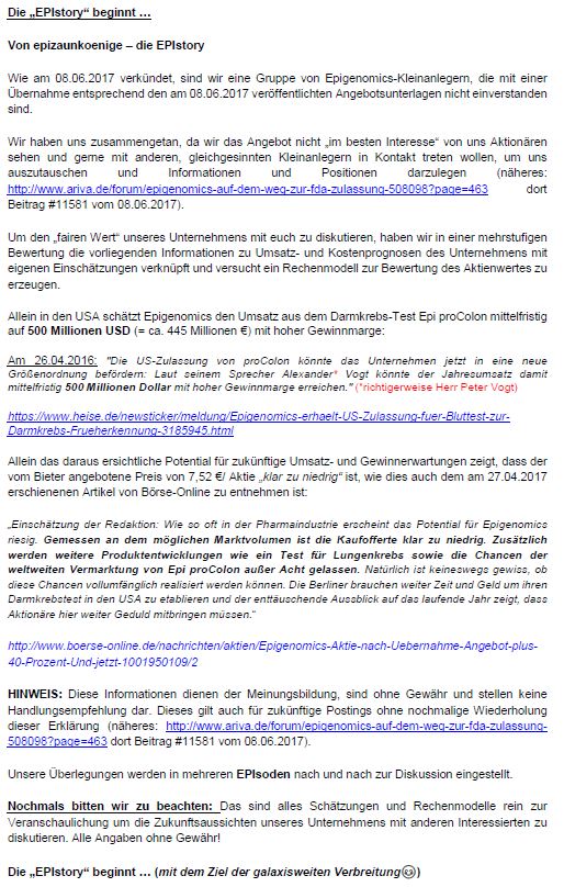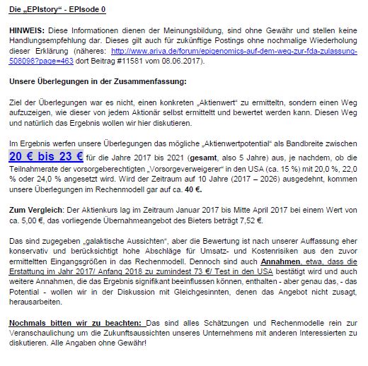 Hatte auf Wunsch der Company mehrere längere Telefonate mit Greg Hamilton: Klar, die sehen natürlich was wir Dank Euch für ein following generieren und das das mit der Zustimmung eng werden könnte. Fakt ist aber auch, dass Epi neue Mittel braucht und er hat versucht mir glaubhaft zu machen, dass der Deal alternativlos sei. Dies wird er auf der HV darlegen. Mein Gegenvorschlag, das wenn das so ist und die Nasdaqoption und andere nicht möglich waren, warum man nicht ein Earn-out Modell gewählt hat, bei dem wir partizipiert hätten, wenn zeitnah Dinge , wie Aufnahme in die hedis guidelines, American Cancer Society Empfehlung o.ä. kurz nach der Übernahme erfolgt wären. Dann wäre der Übernahmepreis niedriger und die Berechnung kompliziert sagt Greg, kurzum ich habe jetzt einen Einblick von der anderen Seite des Tisches bekommen, wenn man ihm glauben schenken kann Und bin verwirrter als vorher. Die Anwälte habe ich gefeuert, weil die mich mehrfach im Stich gelassen haben und zu allem Übel bin ich ab morgen früh bis Sonntag auf einer vor langem geplanten Kurzreise. Vielleicht kommt die Eingebung unterwegs , wenn einen gewissen Abstand von den Dingen bekommt. Best Regards Nikodimi P.S wäre jemand so freundlich dies auf dem Nachbarforum einzustellen