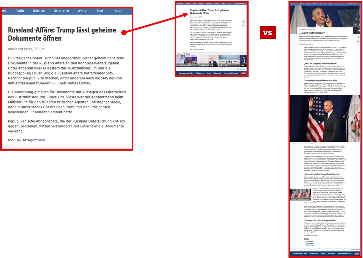 Alle drei Themen wurden von der gleichen Redaktion "red, ORF.at/Agenturen" behandelt. Obwohl Trump in "bester Bemühung" war (LIVE Übertragung des Telefongesprächs mit dem mexikanischen Präsident), scheint es, dass für die ORF-Redaktuere das Thema '"US-Mexiko"- Handelsabkommen' nicht wirklich interessant, sensationell oder wichtig genug war. Man kann durchaus verstehen, denn das Thema stellt "nur" ein Erfolg für Trump dar, somit entsprach nicht dem "Bashing"-Format.