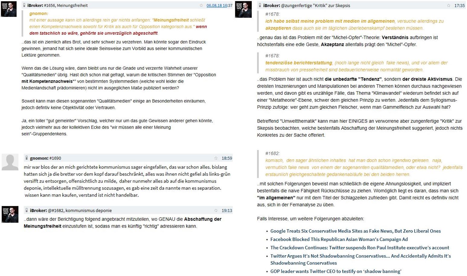 Sollte es sich jedoch dieses Verhalten damit nicht erklären lassen - da die betroffene Person schneinbar thematische Argumentationen und besonders Details vermeidet - dürften dann andere Bestrebungen sein. Interessant nur, dass die Autoren der jeweiligen Threads mit verworrenen Rhetorik im Zentrum des Interesses steht. Gleichermaßen im gleichen Zug "gut gemeinte" Gedankengänge wie "Abschaffung der Meinungsfreiheit" und "Akzeptanz und Verständnis für Medien" salbungsvoll vermitteln.