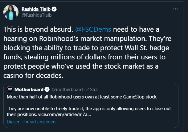 Die Front aus WSB, Demokraten (Tlaib, AOC), Republikanern(Trump jr, Cruz), Elon Musk, Levi & Korsinsky (Anwälte) etc. war wohl doch zuviel für RH ... LOL.
