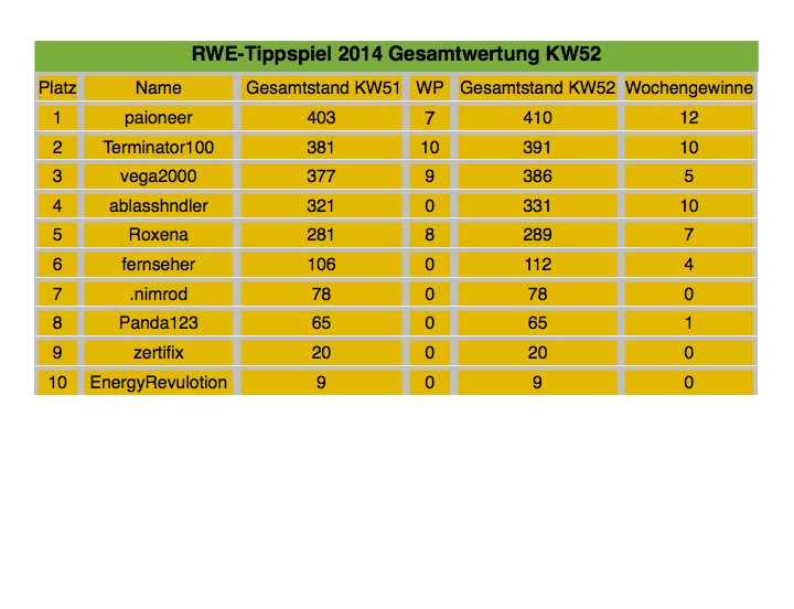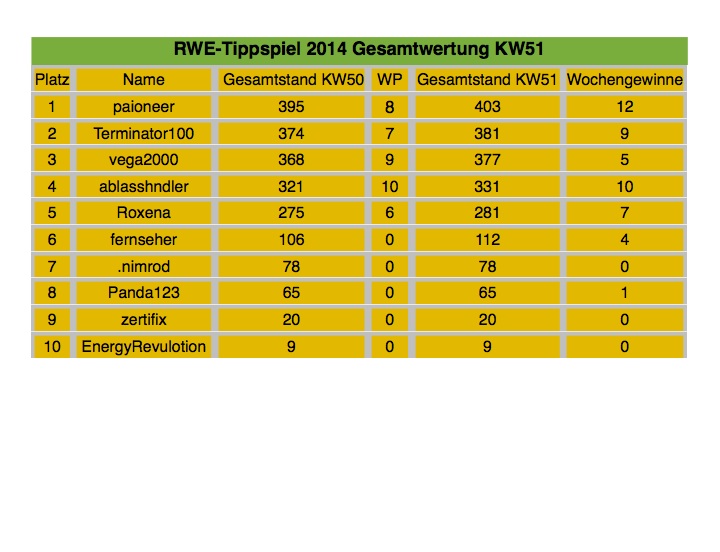 wenn du magst biete ich dir für den letzten Tipp am Montag den 30.12.14 die doppelte Punktzahl für alle an. ( aber nur wenn gleichzeitig keine Änderungen an diesem Tag akzeptiert werden.