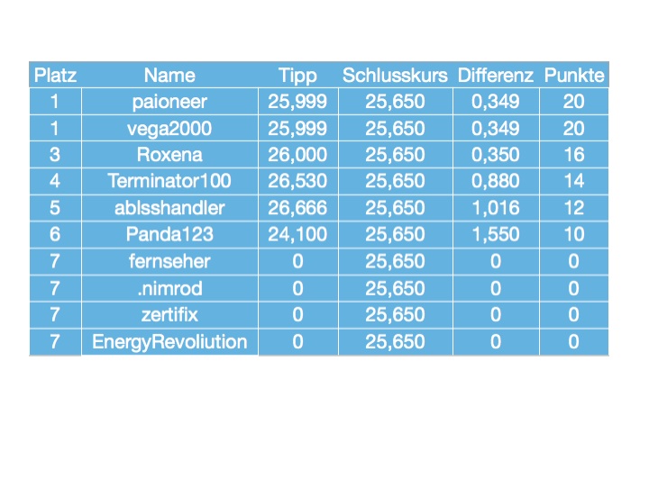 *Aus sportlicher Sicht wäre es so, wenn zwei auf Platz eins beim Wochentipp liegen (Tipp KW 53, paioneer & vega2000 beim ersten Tipp 25,999) dann entfällt der zweite Platz, -ich habe Euch hier mal ein Beispiel herausgesucht: