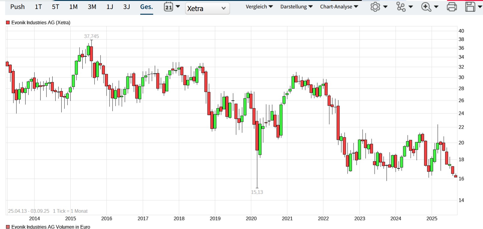 Evonik Die Evonik-Akt­ie findet zurzeit keinen Boden. Der Anstieg im ersten Quartal ist wieder völlig hinfällig geworden. Am Mittwoch gewinnt sie leicht und steht aktuell bei rund 16,70 €. Damit befindet sie sich wieder auf dem Niveau zum Jahresanfa­ng. Lohnt sich jetzt schon ein Einstieg?
