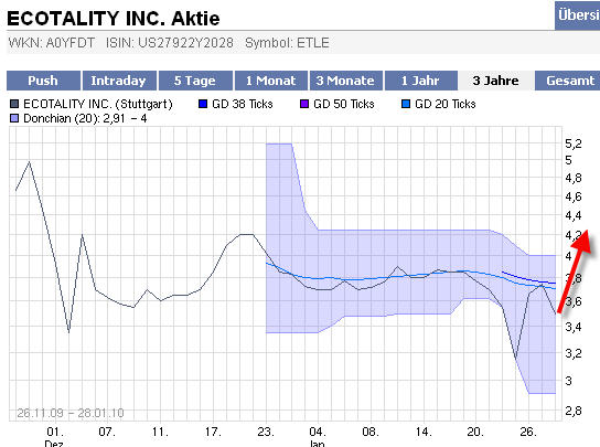 Nach den heutigen News könnte Ecotality wieder über 3,4 € kommen. Dann wäre zumindest kurzfristig der Abwärtstrend gestoppt und wenn es sich über 3,4 € halten kann, würde sich der Trend nach oben weiter fortsetzen. Das kurzfrisitge unterschreiten der Widerstandslinie bei 3,4 € wäre dann als Bärenfalle zu sehen.