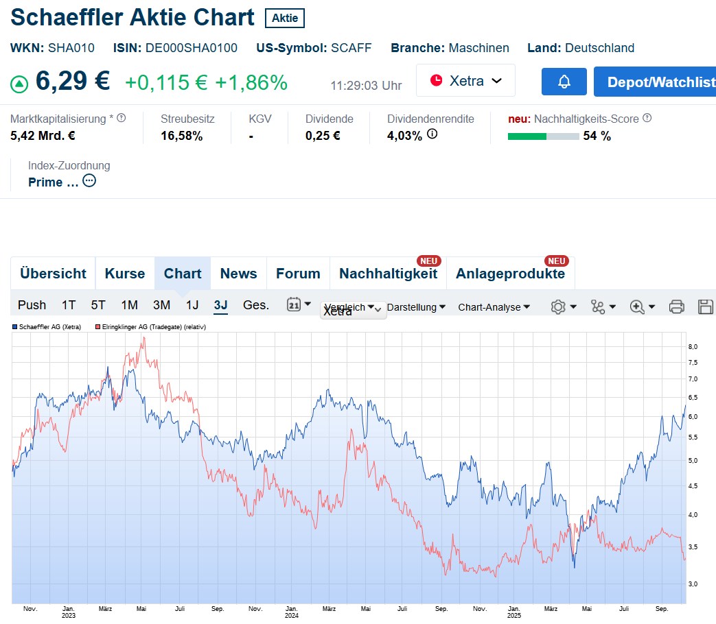 Aktuell steht Schaeffler bei 6,30 Euro und Elringklinger bei 4,20 bis 4,25 Euro.