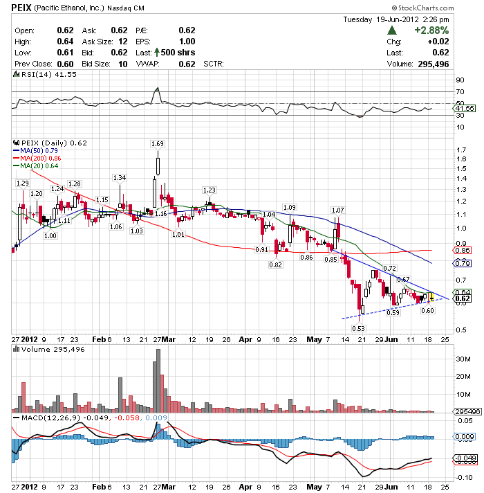Pacific Ethanol announced on June 27, 2012 that it has increased its ownership of New PE Holdco, LLC from 34% to 67% at a cost of $20 million. At the same time the company has amended the Pacific Ethanol credit agreement with certain lenders and announced a proposed offering of common stock and warrants.