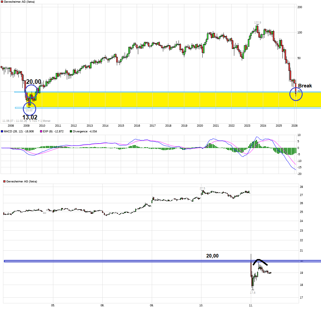 Aus charttechnischer Sicht wurde heute die horizontale Marke von 20€ aus Mitte 2009 durchbrochen. Aktuell notiert man unter dieser Marke. Sollte es nicht schnell wieder gelingen diese alte Marke klar zu überwinden, dann könnte daraus nun ein künftiger Widerstandsbereich werden. Dann wäre auf der Unterseite die nächste größere horizontale Unterstützung um 13€. Da man leider befürchten muß, daß hier noch weitere unschöne Dinge verkündet werden und die LV scheinbar noch immer keine Lust verspüren zu covern, wirkt die Gefahr nicht gering noch nicht den Boden der Korrektur gesehen zu haben. Wobei man natürlich auch sehen muß, daß irgendwann das negative Sentiment bzw. die emotionale Einstellung gegenüber dem Wert der wahren fundamentalen Lage nach unten zu weit enteilen könnte. Von daher mal abwarten bis negative Dinge keine nennenswerte Kursrücksetzer mehr verursachen. Dann könnte die spekulative Zeit kommen für technische Gegenreaktion.