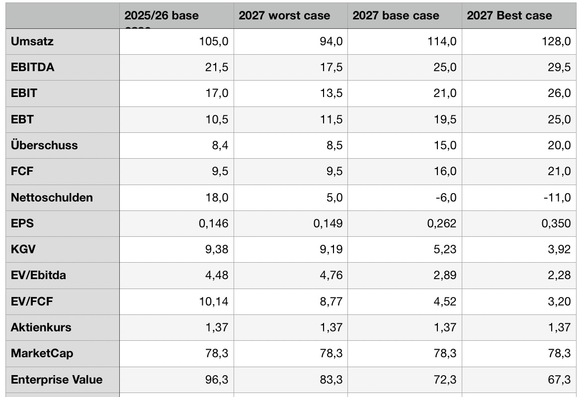 Sprich, manch ein Anleger dürfte einfach durch die Umsatzrückgänge zuletzt komplett am Geschäftsmodell zweifeln. Und dann ist im Zweifel die Bewertung auch egal. Wenn man 2027 nur noch 80 Mio Umsatz bei 12 Mio EBITDA macht, hilft auch kein Börsenwert von 65-70 Mio.