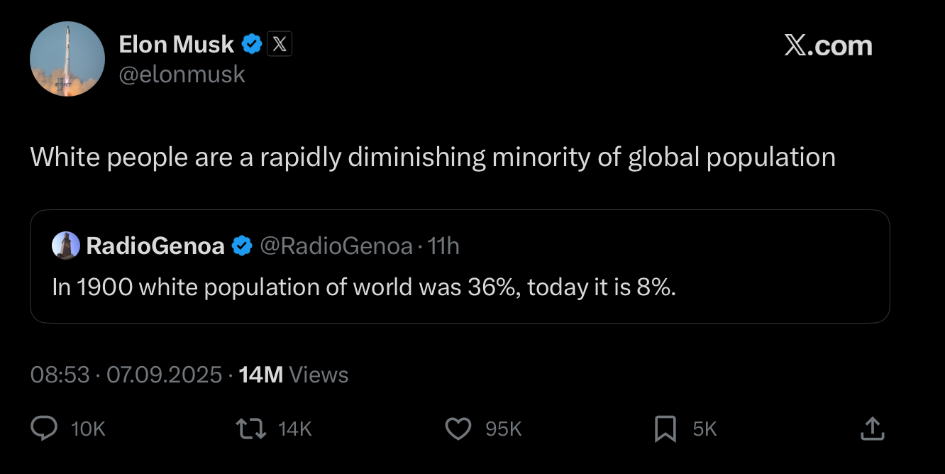 Wenn dein Vorbild, also der ehrenwerte Herr Musk, ständig und unaufhörlich Werbung für extrem rechte politische Parteien macht (international) und selbst ständig extrem “rechtes” Gedankengut verbreitet, mit was soll man das sonst vergleichen?